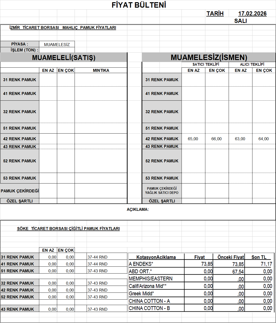 | 42 Renk Pamuk | 0,00 - 0,00 | 0,00 - 0,00 |