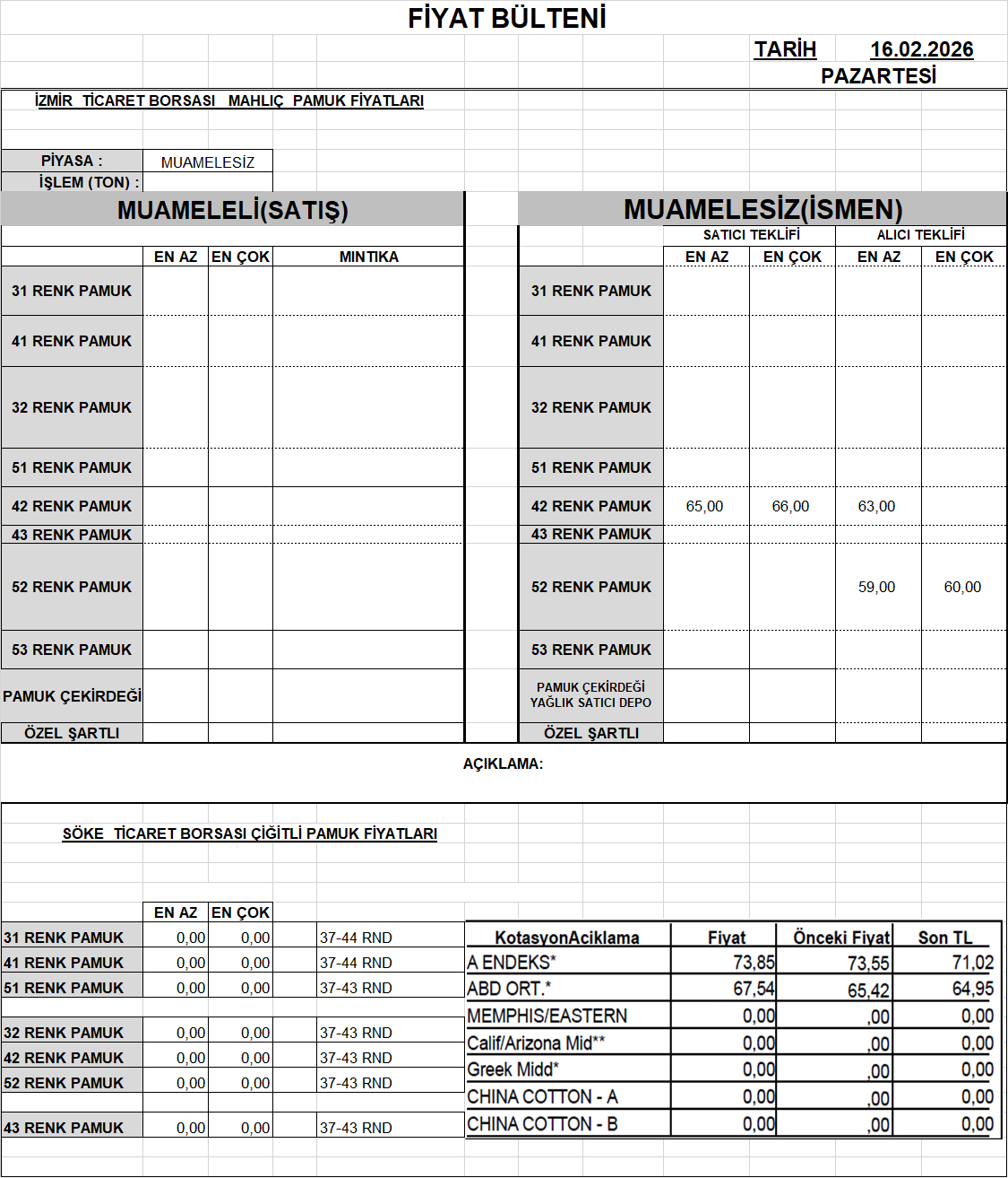 | 42 Renk Pamuk | 0,00 - 0,00 | 0,00 - 0,00 |